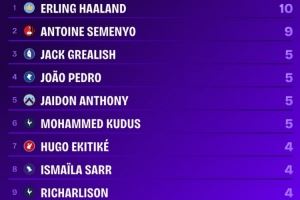 哈兰德成本赛季英超首位直接参与进球数上双球员,塞梅尼奥9球